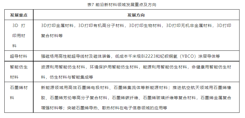 前沿新材料領域發展重點及發展方向主要包括3D打印用材料、超導材料、智能仿生材料、石墨烯材料等(見表7)。